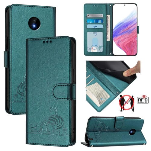 Funda de Cuero Rfid para Nokia C10/C20 con Relieve de Rata y Gato y Cordón (Verde Pavo Real)