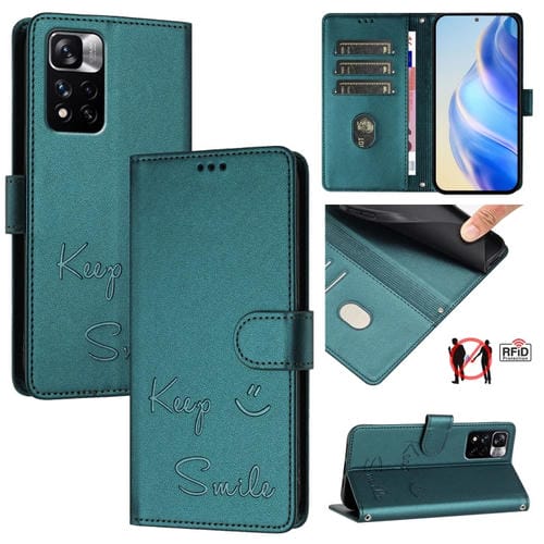 Funda de Cuero Rfid con Relieve de Sonrisa Global para Redmi Note 11 Pro 5G/4G (Verde Pavo Real)