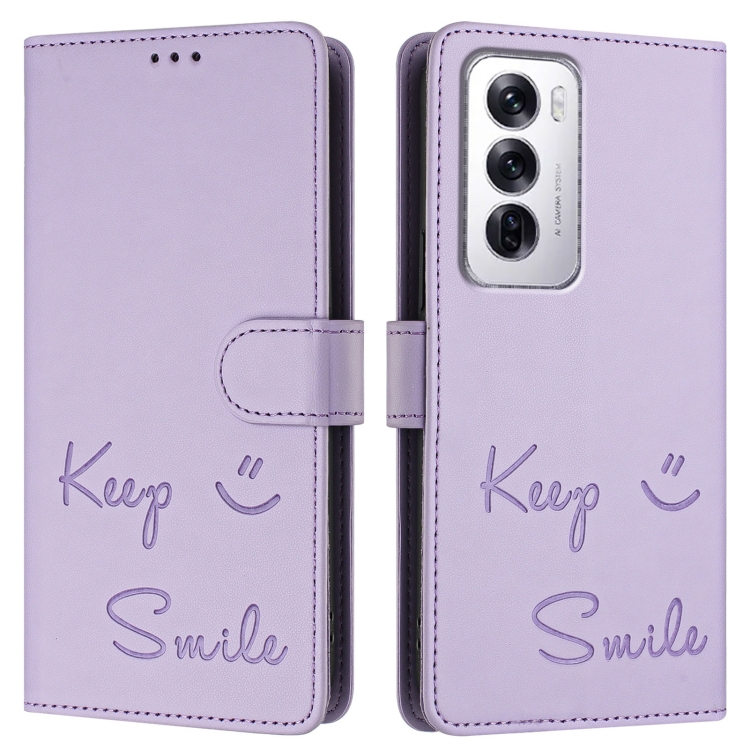 Funda de Cuero Rfid con Relieve Smile para Oppo Reno12 Global (Morado Claro)