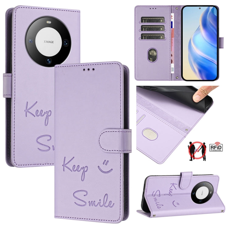Funda de Cuero Rfid con Relieve Sonriente para Huawei Mate 60 (Morado Claro)