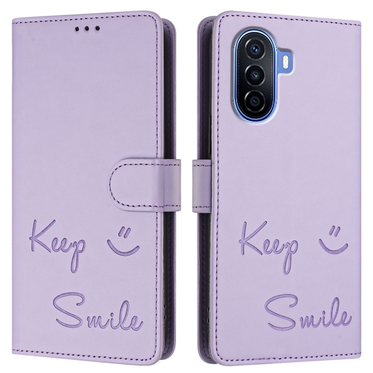 Funda de Cuero Rfid con Relieve Sonriente para Huawei Nova Y70 Plus (Morado Claro)