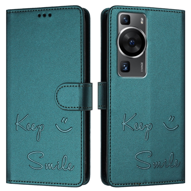 Funda de Cuero Rfid con Relieve Sonriente para Huawei P60/P60 Pro (Verde Pavo Real)