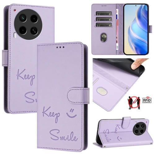 Funda de Cuero Rfid con Relieve Sonriente para Tecno Camon 30 5G/4G (Morado Claro)