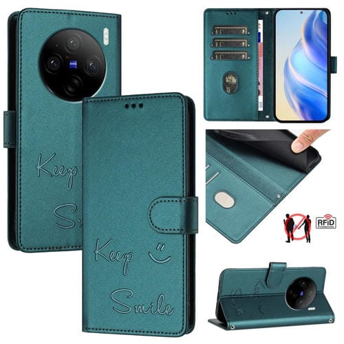 Funda de Cuero Rfid con Relieve Sonriente para Vivo X100 (Verde Pavo Real)