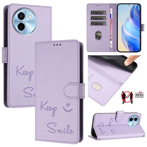 Funda de Cuero Rfid con Relieve Sonriente para Vivo Y38 5G (Morado Claro)