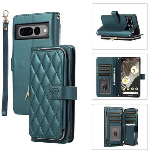 Funda de Cuero Tipo Billetera con Cremallera Completa y Diseño Rombal para Google Pixel 7 Pro (Verde)