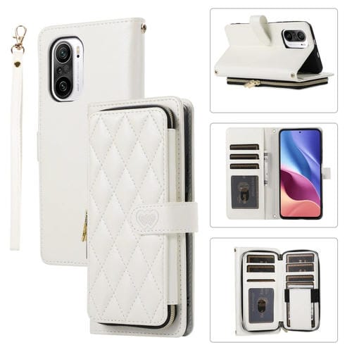 Funda de Cuero Tipo Billetera con Cremallera Completa y Diseño Rombal para Xiaomi Poco F3 (Blanca)