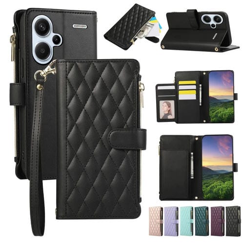 Funda de Cuero Tipo Billetera con Cremallera Rombal para Redmi Note 13 Pro+ 4G/5G (Negra)