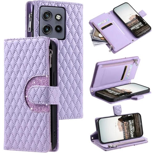 Funda de Cuero Tipo Billetera con Cremallera y Celosía Brillante para Motorola Edge 50 Neo (Morado)
