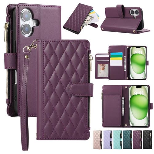 Funda tipo billetera Cuero iPhone 16 Plus Cremallera Diseño Rombal (Morado Oscuro)
