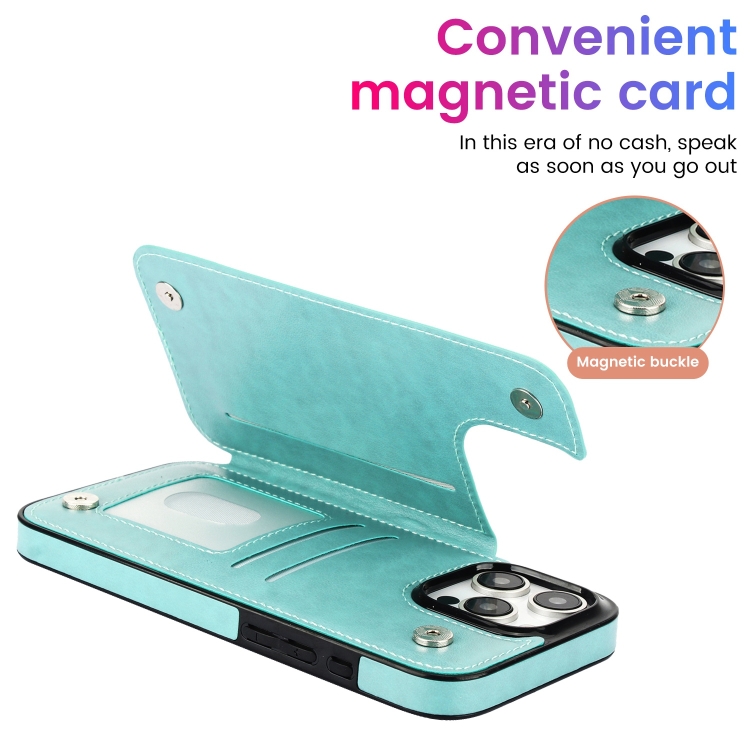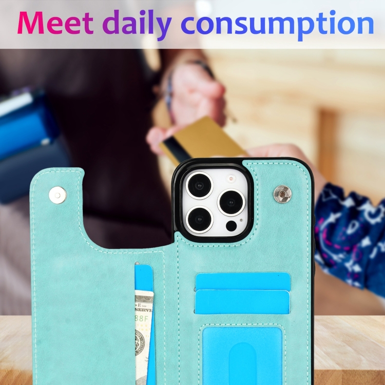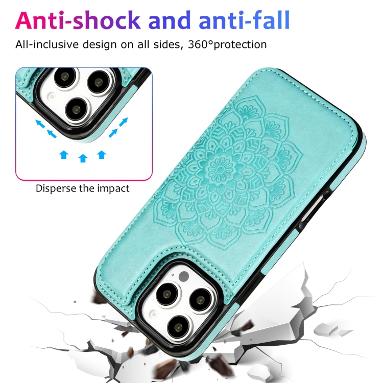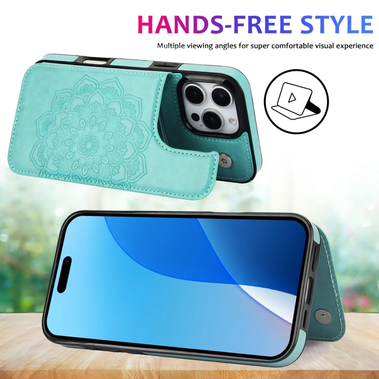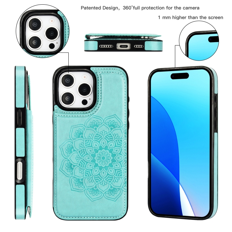 Funda de Cuero Tipo Billetera con Doble Hebilla y Diseño de Mandala para iPhone 16 Pro Max (Verde)