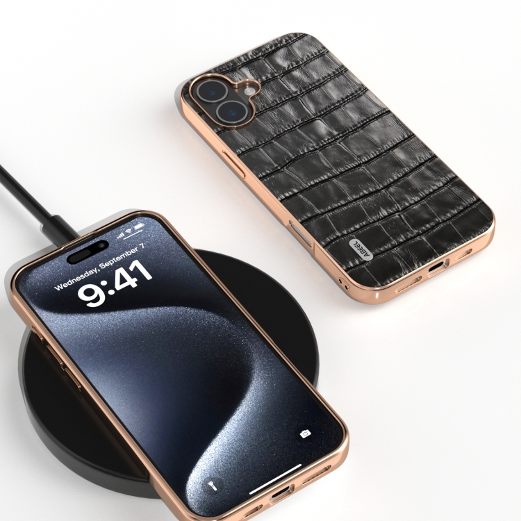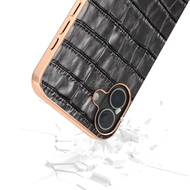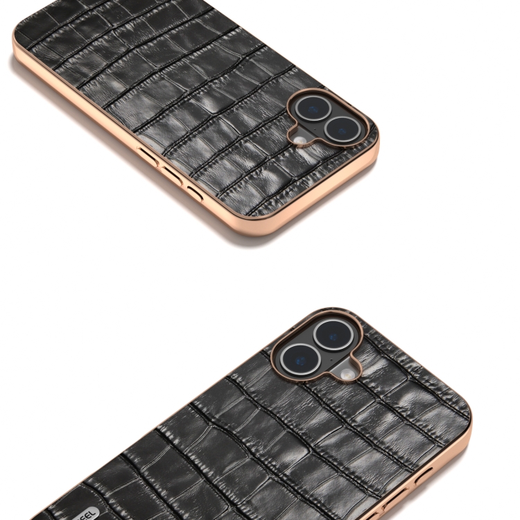 Funda de Piel Auténtica Abeel con Textura de Cocodrilo y Marco Galvanizado para iPhone 16 (Negro)