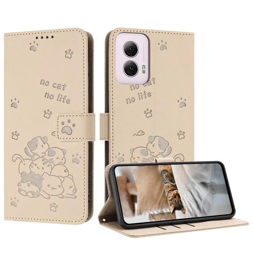 Funda de Piel Motorola Moto G Power 5G 2024 con Diseño de Gatito en Relieve y Cordón (Beige)