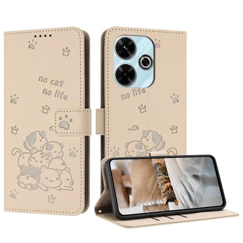 Funda de Piel con Diseño de Gatito En Relieve y Cordón para Xiaomi Poco M6 4G (Beige)