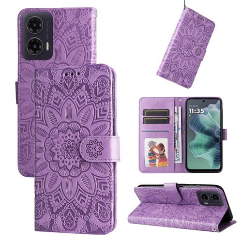 Funda de Piel Motorola Moto G35 con Diseño de Girasol en Relieve (Morado)