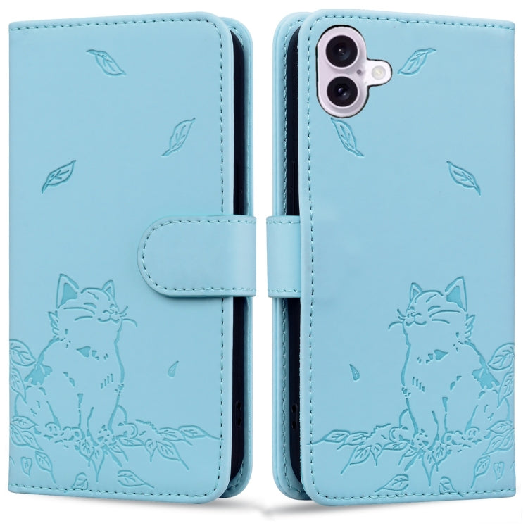 Funda de Piel para iPhone 16 Estampado de Gato (Azul Cielo)