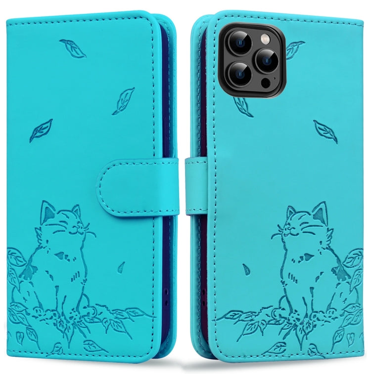 Funda de Piel para iPhone 16 Pro Estampado de Gato (Azul Lago)