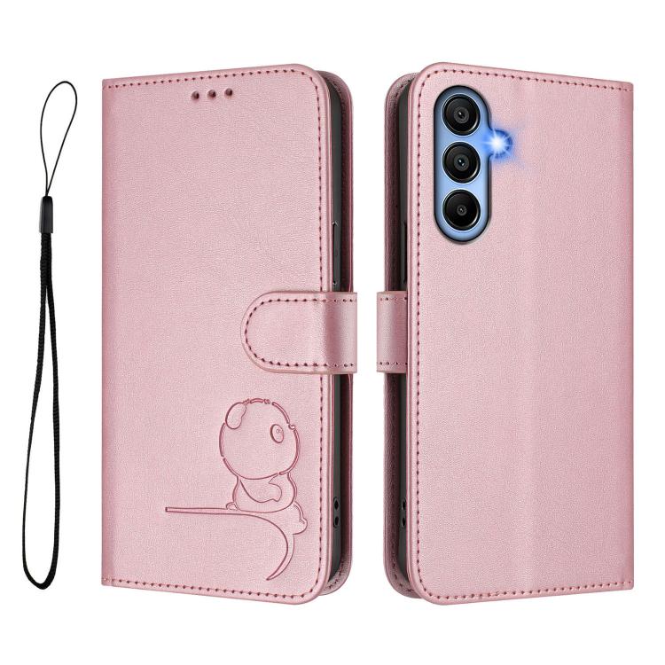 Funda de piel con estampado de panda y RFID para Samsung Galaxy A15 5G/4G con cordón (rosa)