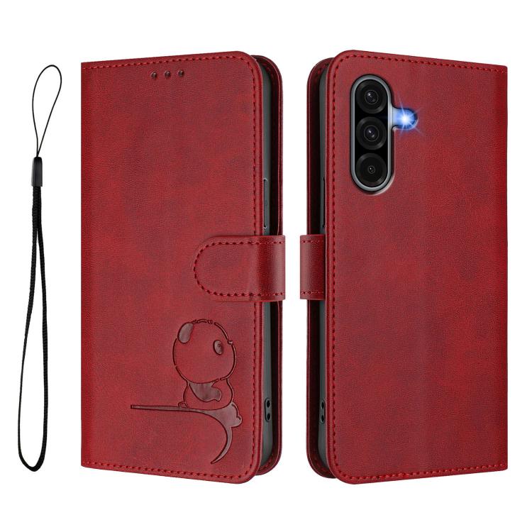 Funda de piel con estampado de panda y RFID para Samsung Galaxy A56 5G/A36 5G con cordón (rojo vino)