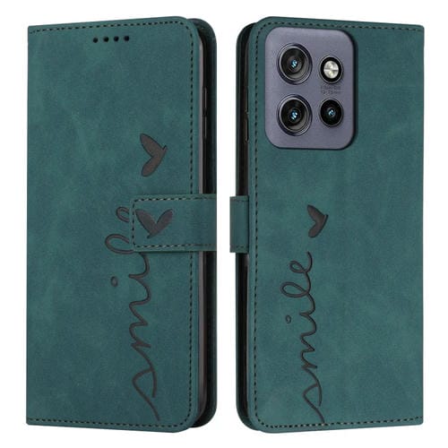 Funda de Piel con Relieve de Corazón para Motorola Edge 50 Neo con Cordón Largo (Verde)
