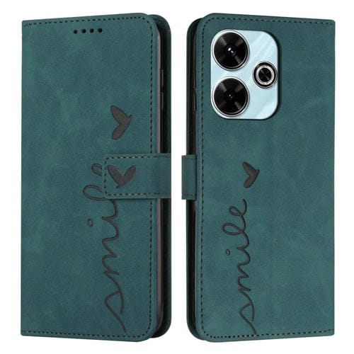 Funda de Piel con Relieve de Corazón para Xiaomi Redmi 13 4G con Cordón Largo (Verde)