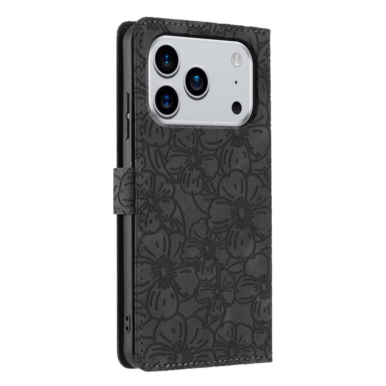 Funda de piel con relieve de flores de cerezo para iPhone 17 Pro Max (negra)