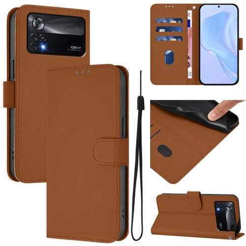Funda de Piel Sintética con Cordón para Xiaomi Poco X4 Pro 5G (Marrón)