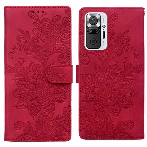 Funda de Teléfono con Hebilla Magnética de Pu con Encaje Floral En Relieve para Redmi Note 10 Pro 4G con Correa para la Muñeca (Rojo)