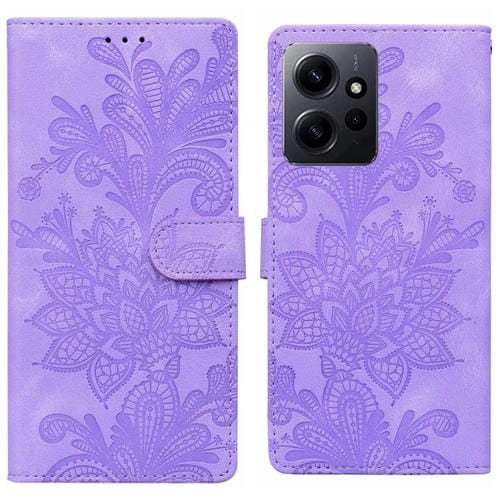 Funda de Teléfono con Hebilla Magnética y Encaje Floral En Relieve para Redmi Note 12 4G Global con Correa para la Muñeca (Morado)