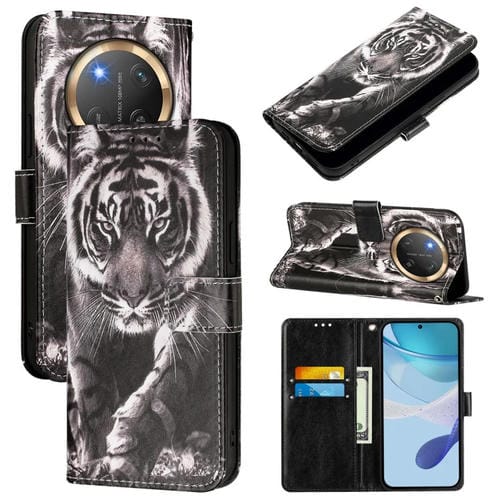 Funda de Cuero para Honor X9C 5G con Tejido Liso y Estampado Tigre (Blanco y Negro)