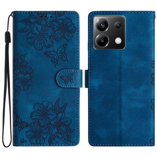 Funda de Teléfono de Pu con Relieve de Piel de Mariposa y Diseño de Flor de Cerezo para Xiaomi Poco X6 (Azul)