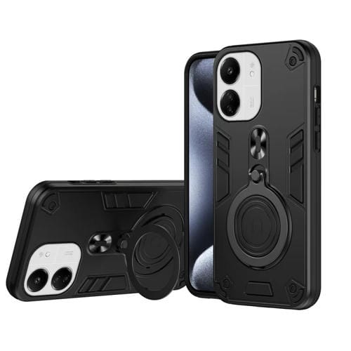 Funda de Teléfono Híbrida de TPU y PC con Soporte Giratorio de 360 Grados y Anillo de Metal para Redmi 13C 4G/5G (Negro)