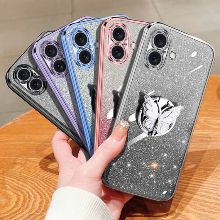 Funda TPU con Soporte Mariposa Purpurina Degradada para iPhone 16 (Plateada)