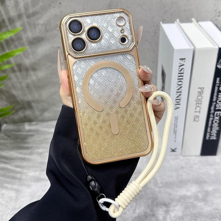 Funda de TPU MagSafe con ventana grande, diseño de rombos degradados, mate, galvanizada y con correa de mano para iPhone 17 Pro Max (dorada)