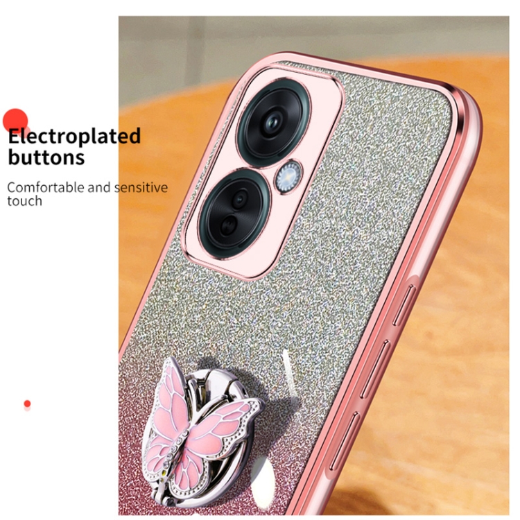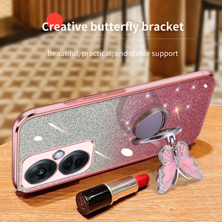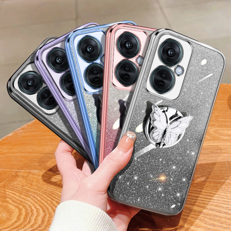 Funda de TPU para Teléfono con Soporte de Mariposa con Purpurina Degradada Plateada para Oppo K11X (Púrpura)