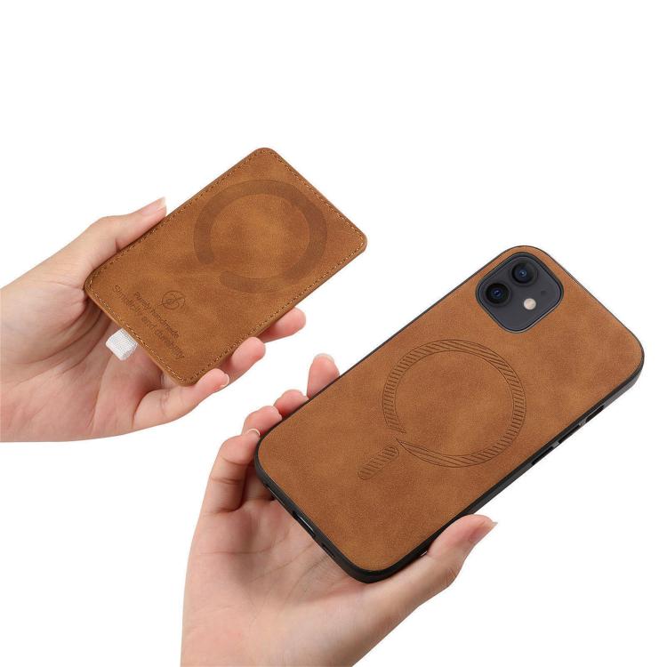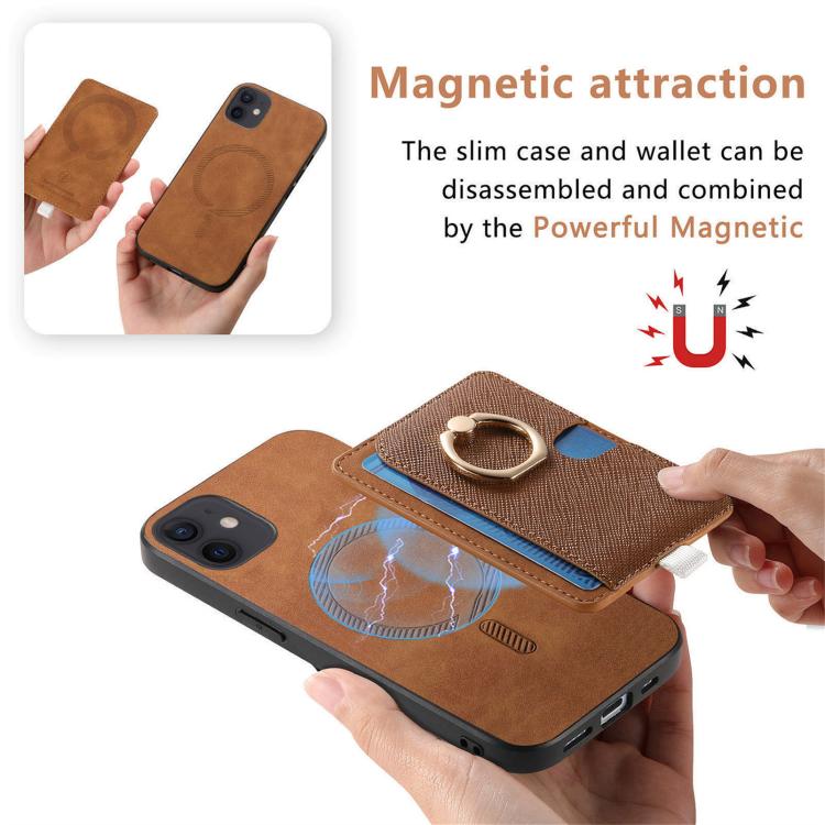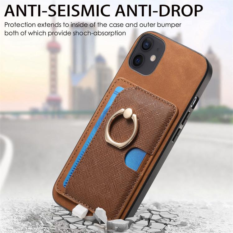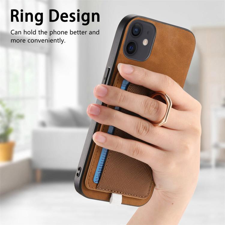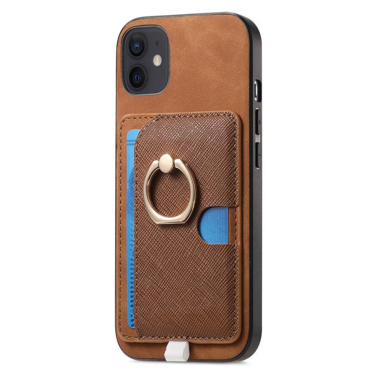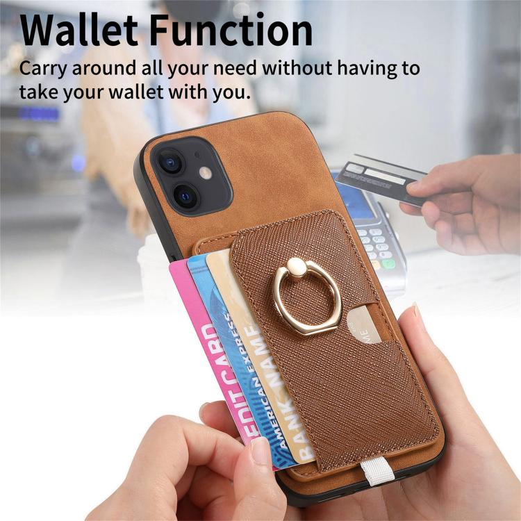 Funda para iPhone 13 con Ranuras para Tarjetas Diseño Retro Cruz Cuero Anillo Lateral (Marrón)