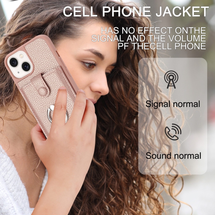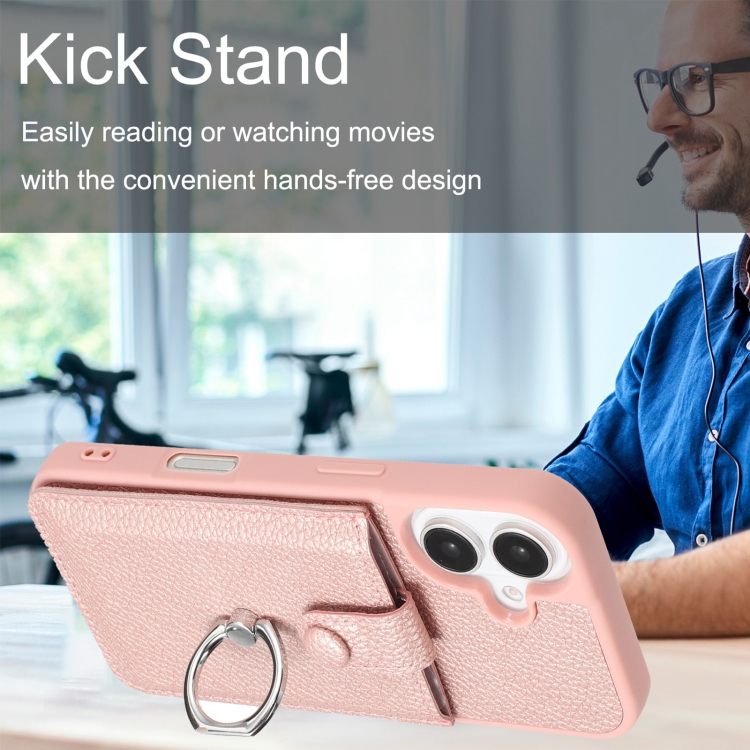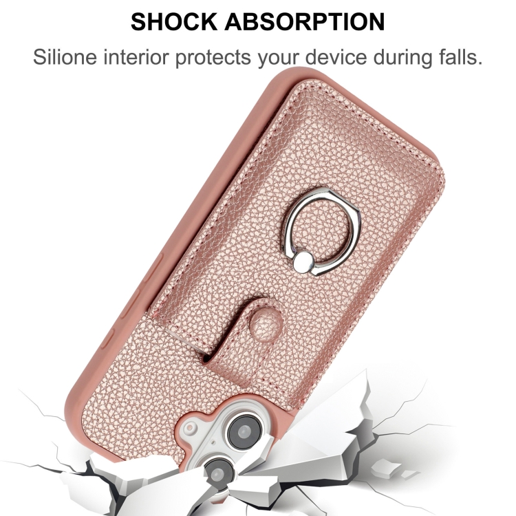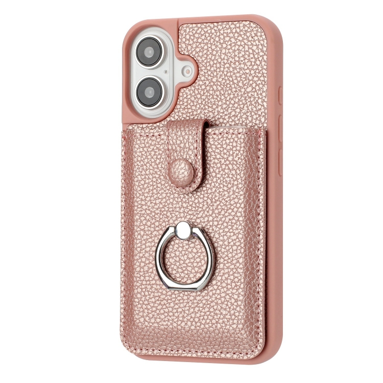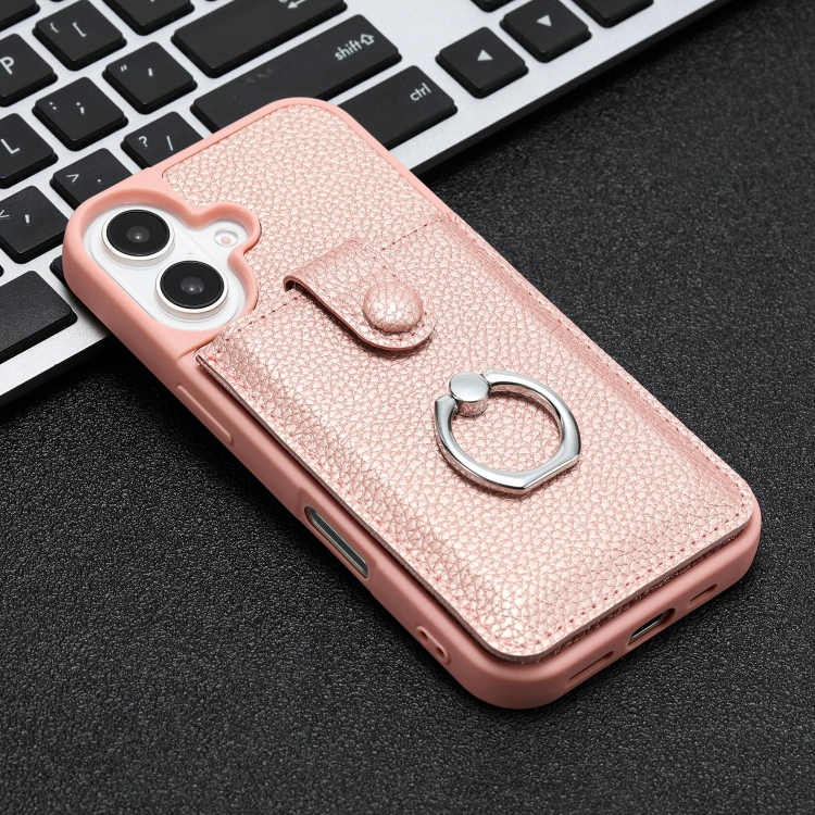 Funda para iPhone 16 Textura de Lichi con Diseño de Tarjeta y Soporte para Anillo (Oro Rosa)