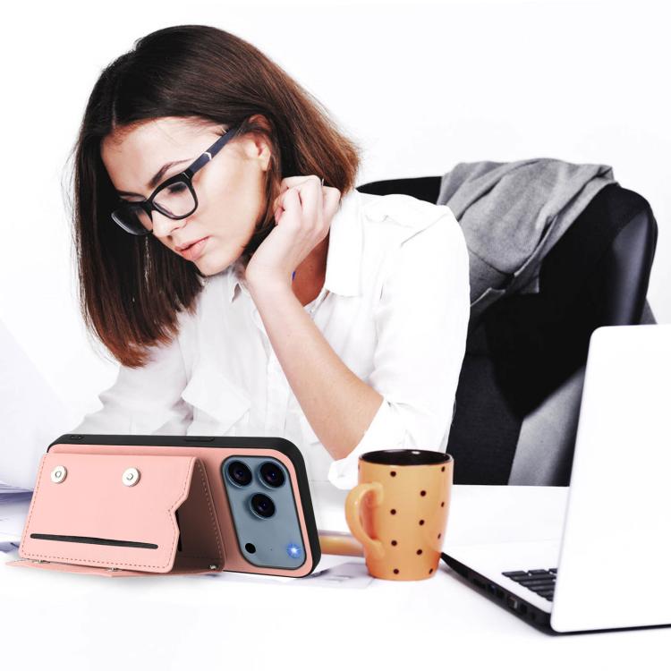 Funda para iPhone 17 Pro Max con cuatro ranuras para tarjetas y correa para la muñeca (rosa)