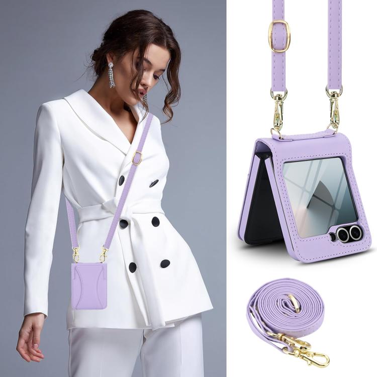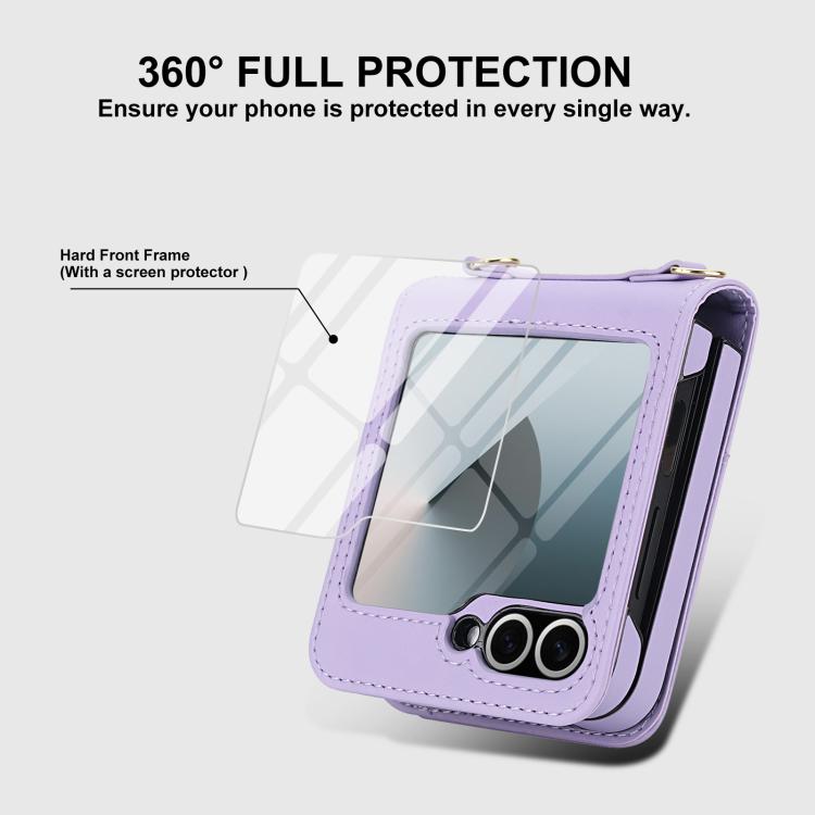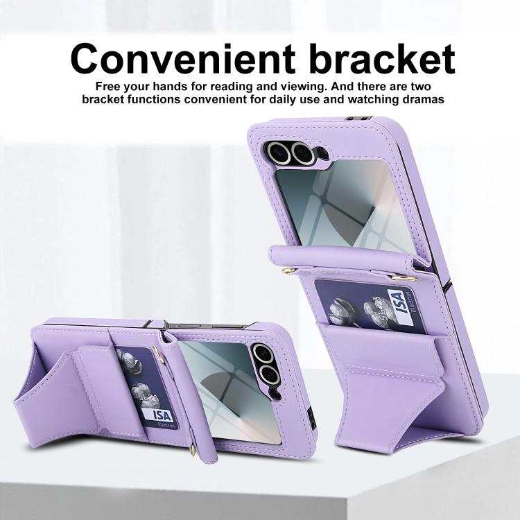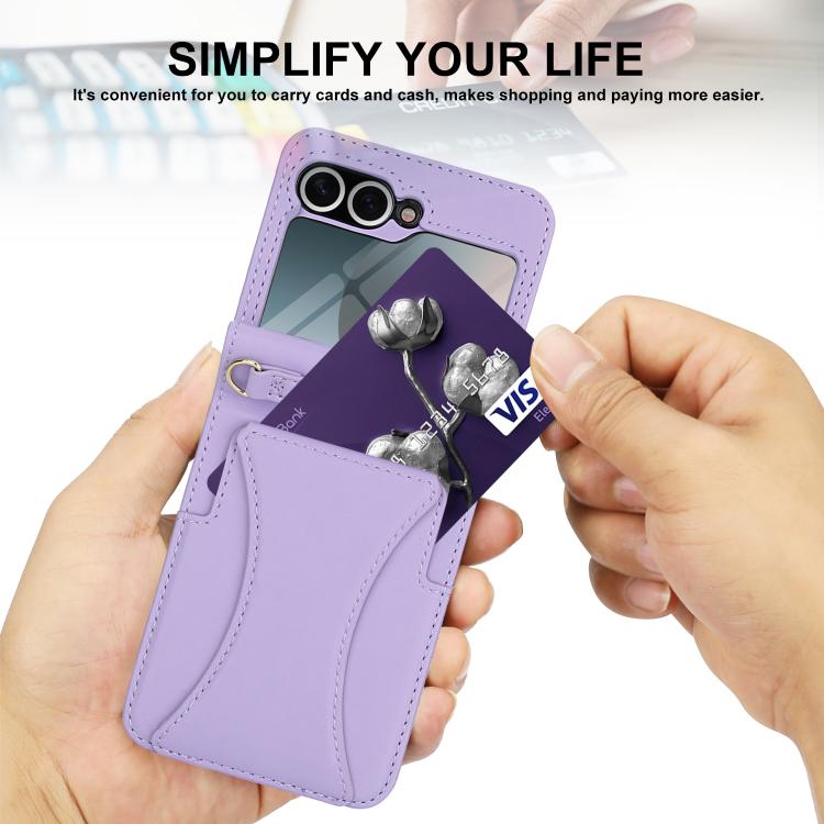 Funda para Samsung Galaxy Z Flip6 con ranura para tarjetas y soporte plegable integrado, con cordón largo y corto (morado)