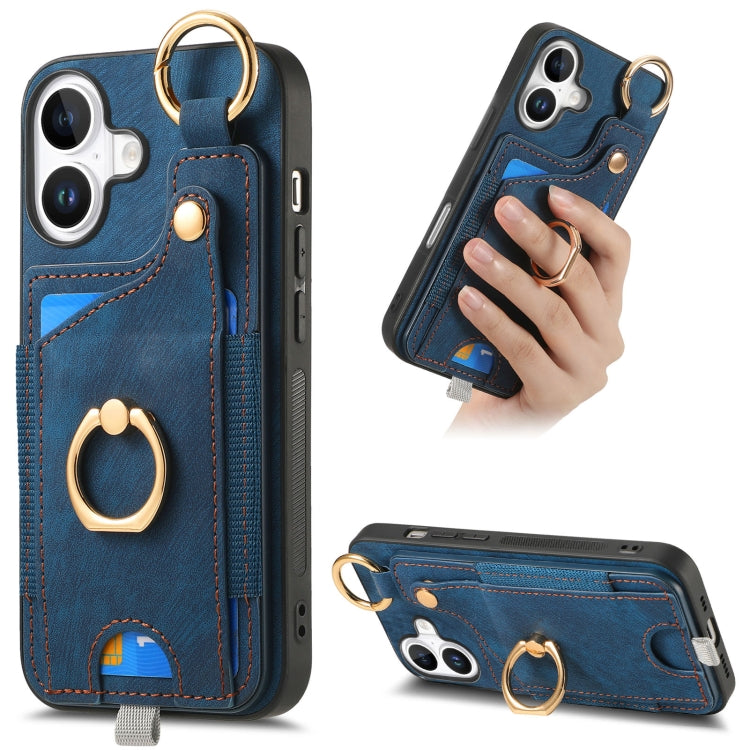 Funda para Teléfono con Anillo y Tarjetero Estilo Retro con Asa para Colgar para iPhone 16 (Azul)
