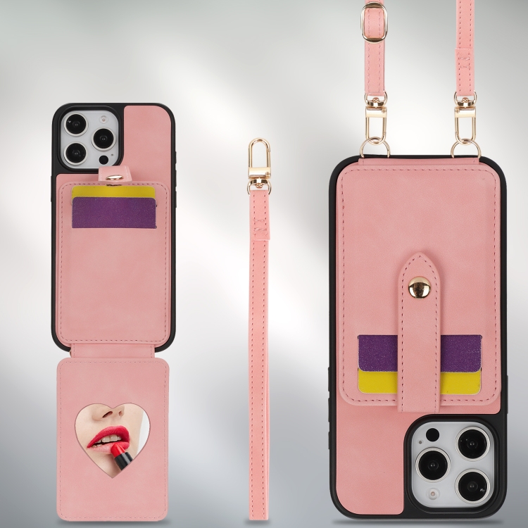 Funda para Teléfono Apple iPhone 16 con Cordón y Diseño de Tarjeta Tipo Bandolera (Rosa)