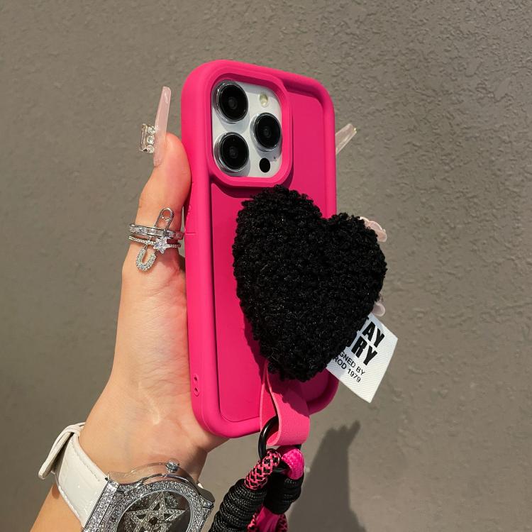 Funda para Teléfono iPhone 16 Pro Max Diseño Corazón de Peluche con Cordón (Rosa Rojo)