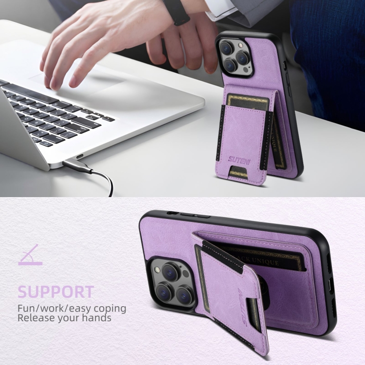 Funda para Teléfono Suteni H03 Piel de Lichi con Tarjetero para iPhone 16 Pro Max (Morado)