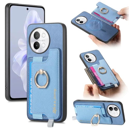 Funda para Teléfono con TaRJetero y Anillo de Cuero con Diseño Retro Magsafe Cross para Vivo S18E 5G (Azul)