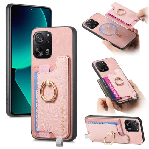 Funda para Teléfono con TaRJetero y Anillo de Cuero con Diseño Retro Magsafe Cross para Xiaomi 13T/13T Pro (Rosa)