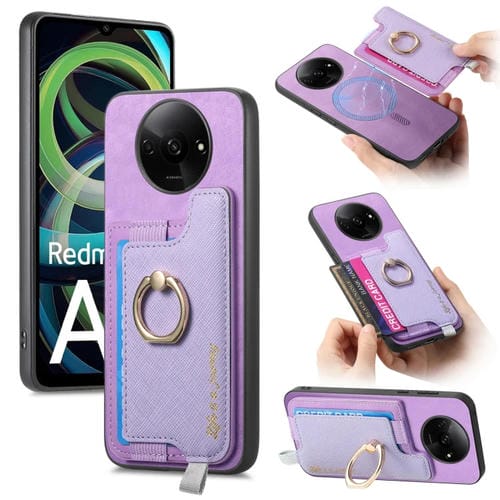 Funda para Teléfono con TaRJetero y Anillo de Cuero con Diseño Retro Magsafe para Xiaomi Redmi A3 (Morado)
