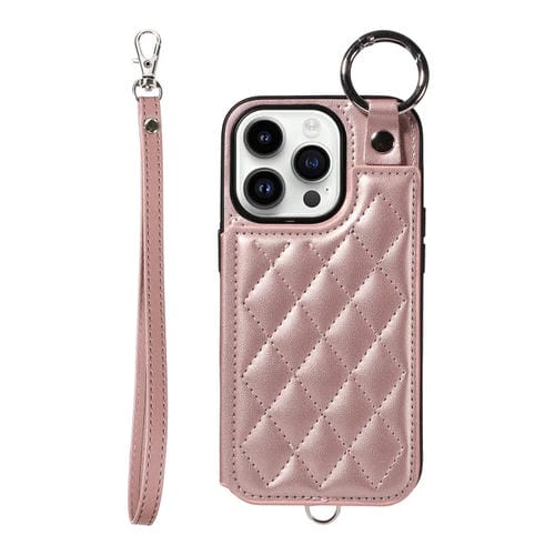 Funda para Teléfono iPhone 14 Pro Textura Rómbica Cordón Corto (Oro Rosa)