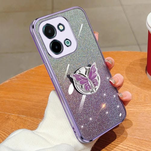 Funda para Teléfono de TPU con Soporte para Mariposas con Purpurina Degradada Chapada para Vivo Y28 4G (Morado)
