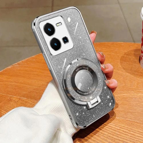 Funda para Teléfono de TPU con Soporte Redondo con Purpurina Degradada Plateada para Vivo Y35 Global 2022 (Plateada)