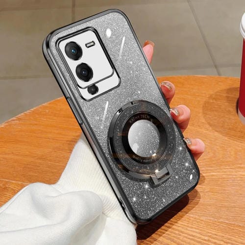 Funda para Teléfono de TPU con Soporte Redondo y Purpurina Degradada Plateada para Vivo S15 Pro (Negra)